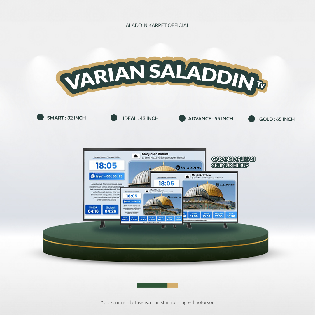 Jam Digital Masjid yang menampilkan waktu & jadwal shalat berbasis gps wilayah setempat. Dengan tampilan yang modern menggunakan Smart tv Saladdin Tv hadir sebagai solusi digital waktu shalat yang akurat di masjid anda.